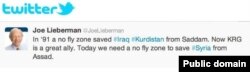 شایهنی باسه سیناتۆر جۆ لیبرمان له تویتهرهکهی خۆیدا نووسیویهتی " له 91 دا ناوچهی دژه فڕین # عێراق # کوردسـتان ی له سهدام پاراست. ئهوا ئێسـتا حکومهتی ههرێمی کوردسـتان هاوپهیمانێـکی گهورهیه. ئهمڕۆش پـێویسـتمان به ناوچهیهکی دژه فڕینه بۆ پاراسـتنی # سوریا له ئهسهد.