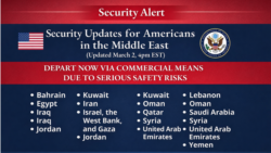هاووڵاتیانی ئەمەریکایی لە بەحڕەین، میسڕ، ئێران، عێراق، ئیسرائیل بە کەناری ڕۆژئاوا و غەززەوە، ئوردن، کوەیت، لوبنان، عومان، قەتەر، سعودییە، سوریا، ئیمارات، وە یەمەن ئاگاداربن کە حکومەتی ئەمەریکا دەڵێت دەستبەجێ ئەو وڵاتانە بەجێبهێڵن.