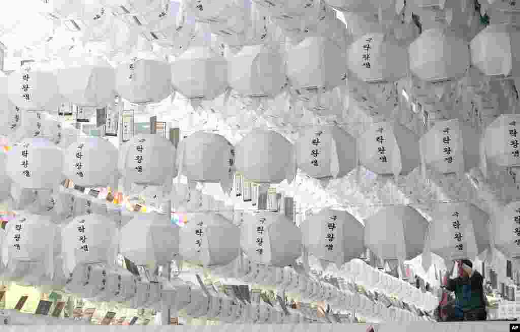 A worker attaches the name tag of a Buddhist who made a donation to a lantern for the upcoming celebrations of Buddha's birthday on May 25 at Jogye Temple in Seoul, South Korea.