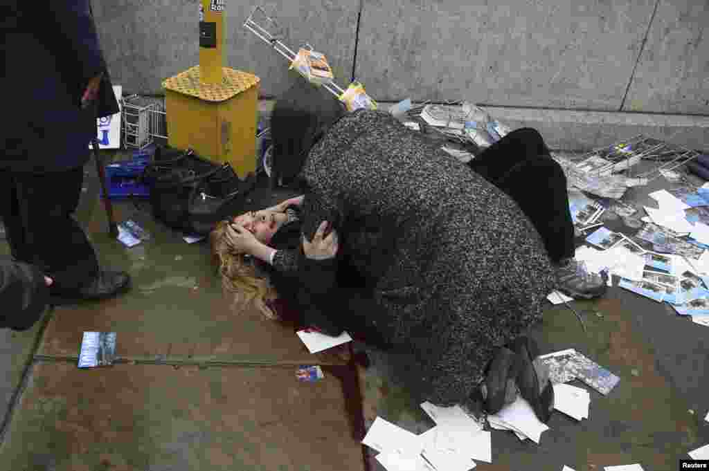 A woman lies injured after a shooting incident on Westminster Bridge in London.