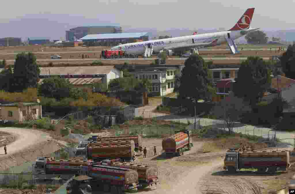 A Turkish Airlines jet that skidded off a slippery runway while landing in dense fog is seen at Tribhuwan International Airport in Kathmandu, Nepal.The plane with 238 people on board was coming from Istanbul. Officials said passengers suffered bruises but no serious injuries.