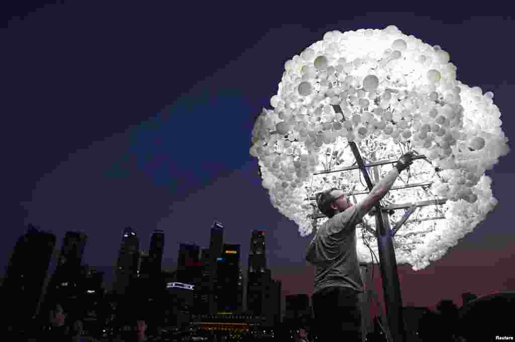 Wayne Garrett of Canada makes final touches to his art installation "Cloud" ,made up of 5000 new and recycled lightbulbs, along the Marina Bay in Singapore.