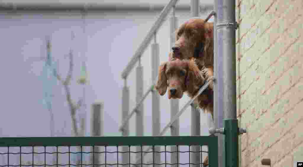 Two Irish Setters look out from an enclosure in Lauw, Belgium.