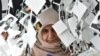 Policemen walk through scattered newspapers and a mask of Kenya's new president (Bottom L) following a stampede outside Kasarani stadium in Nairobi, after supporters of President Uhuru Kenyatta tried to get into the venue to attend his inauguration ceremony.