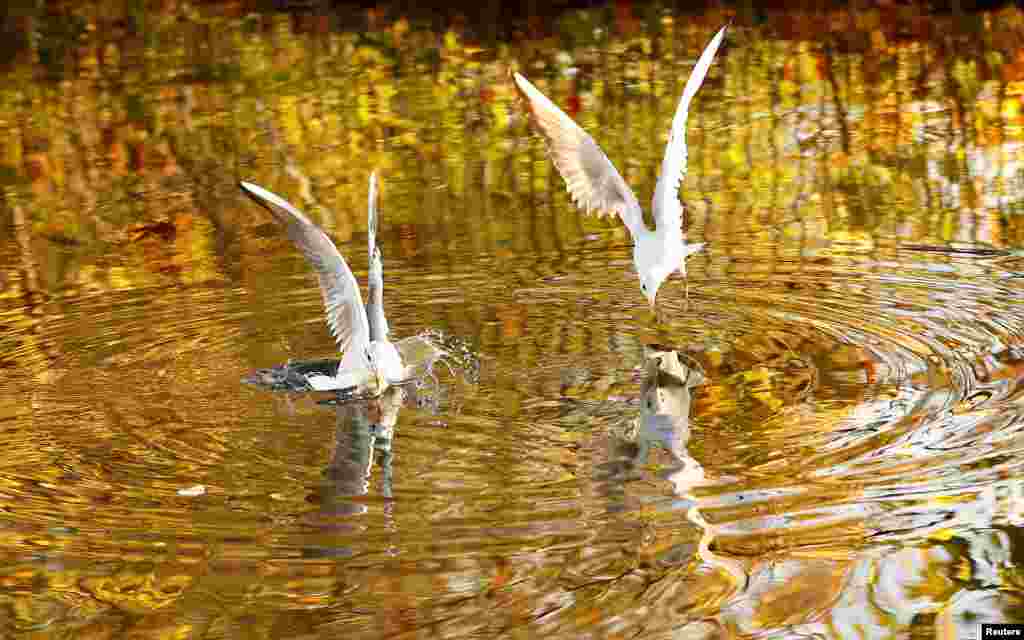 Autumn colors are reflected in the water as gulls dive for food on the Grand Union Canal in Loughborough, Britain.