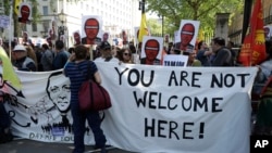 دەیان خۆپـیشاندەر لە لایەنگرانی کورد و ئازادی ڕادەربڕین ئەمڕۆ سێشەممە لە بەردەم بارەگای حکومەتی بەریتانیا گردبوونەوە بۆ دەربڕینی ناڕەزایی بەرامبەر ڕەجەب تەیب ئەردۆغان سەرۆکی تورکیا کە بڕیار ئەمڕۆ لەگەڵ تێرێزا مەی سەرۆک وەزیری بەریتانیا کۆببێتەوە.