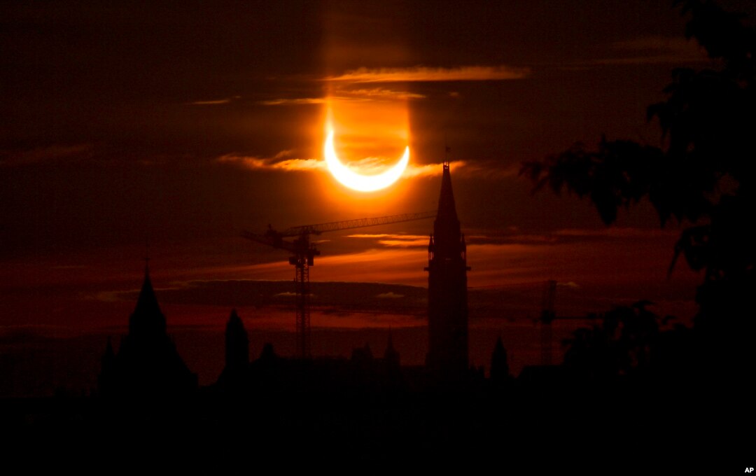 An annular solar eclipse rises over construction cranes and the Peace Tower on Parliament Hill in Ottawa, Canada.