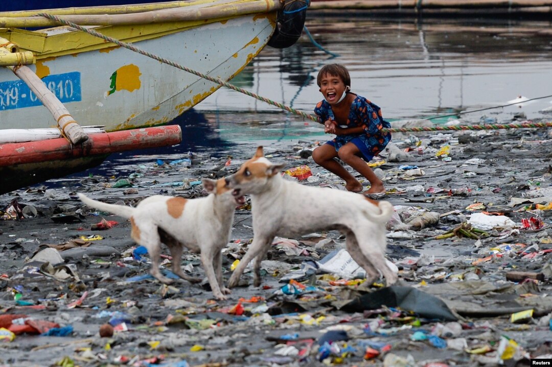 A boy reacts as dogs play along the riverbank of Pasig river in Manila, Philippines.