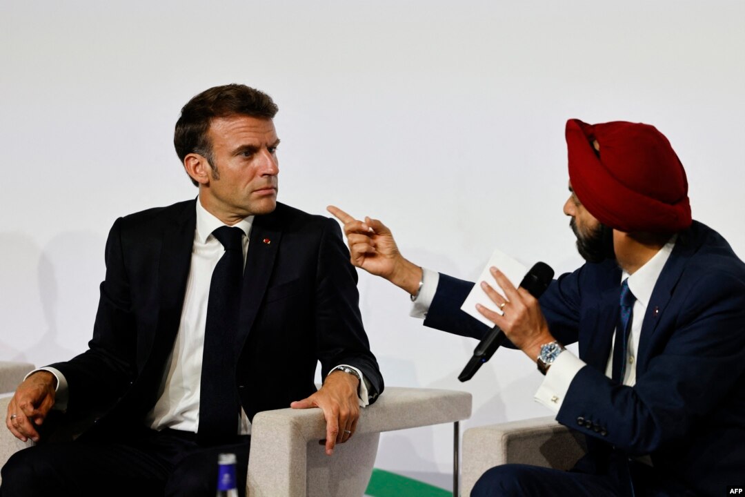 French President Emmanuel Macron, left, looks on during a roundtable discussion on the global economy with World Bank President Ajay Banga during the New Global Financial Pact Summit at the Palais Brongniart in Paris.