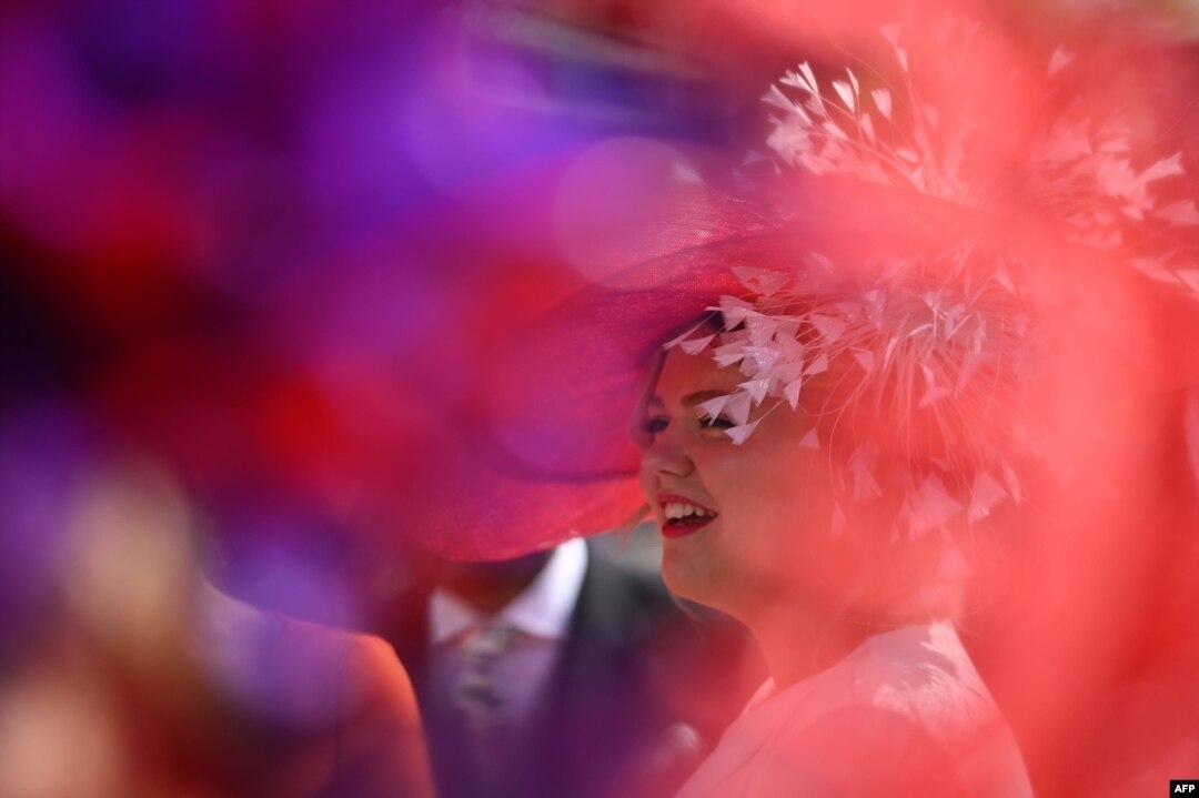 A racegoer smiles in the summer sunshine on Ladies Day, the third day of the Royal Ascot horse racing meeting in Ascot, west of London.