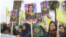 ژنە عەفرینییەکانی کە ئاوارەی هەرێمی شەهبا بونە پشتگیری لە چالاکییەکانی مانگرتنی پەرلەمانتاری هادەپە لەیلا گوڤەن دەکەن.